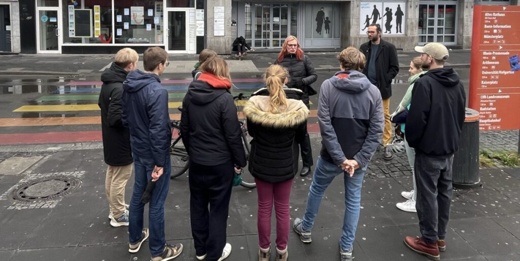 Mara zeigt Orte in Bonn, die mit ihren Erfahrungen von Wohnungslosigkeit, ihrem Weg als trans* Frau und mit queeren Lebensrealitäten verbunden sind. Gemeinsam sprechen wir darüber, wie es ihr gelingt, selbstbestimmt zu leben sowie kulturell aktiv und sozial engagiert zu sein. Außerdem tauschen wir uns darüber aus, was für ein gutes gesellschaftliches Miteinander in Bonn wichtig ist.