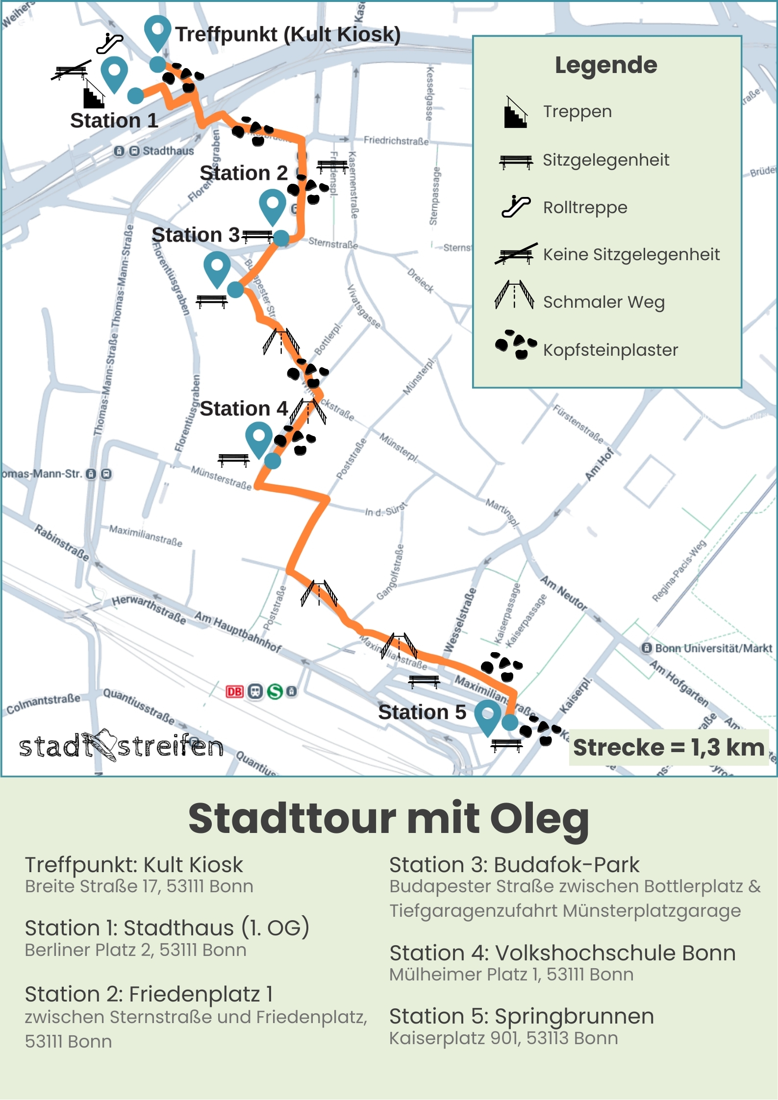 Die Stadtführungen sollen sichtbar machen, was in der öffentlichen Auseinandersetzung über Migration oft übersehen wird: Soziale, politische und emotionale Realitäten von Menschen, die aus ihren Herkunftsländern fliehen mussten und in Bonn ein neues Leben beginnen möchten. Wir behandeln dabei Themen wie Fluchtursachen, Unterbringung sowie gesellschaftliche Teilhabe und Ausgrenzung.